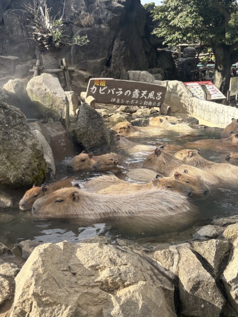 ちょうどカピバラが温泉に入っている姿を見ることができて、とても癒されました。 のんびりした表情にほっこり…☺️