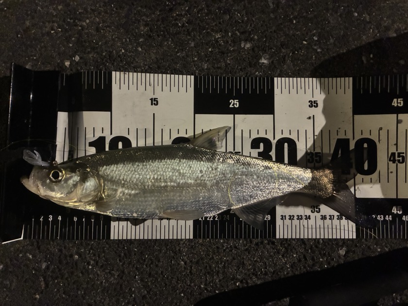 夜22:00を回って中々釣れなかったのでそろそろ諦めて帰ろうとしてた頃、ブルッと竿先に小気味よいアタリが伝わり逃してたまるかとリールを巻くと水面に銀色の魚体が煌めき目当ての魚だと確信しました。